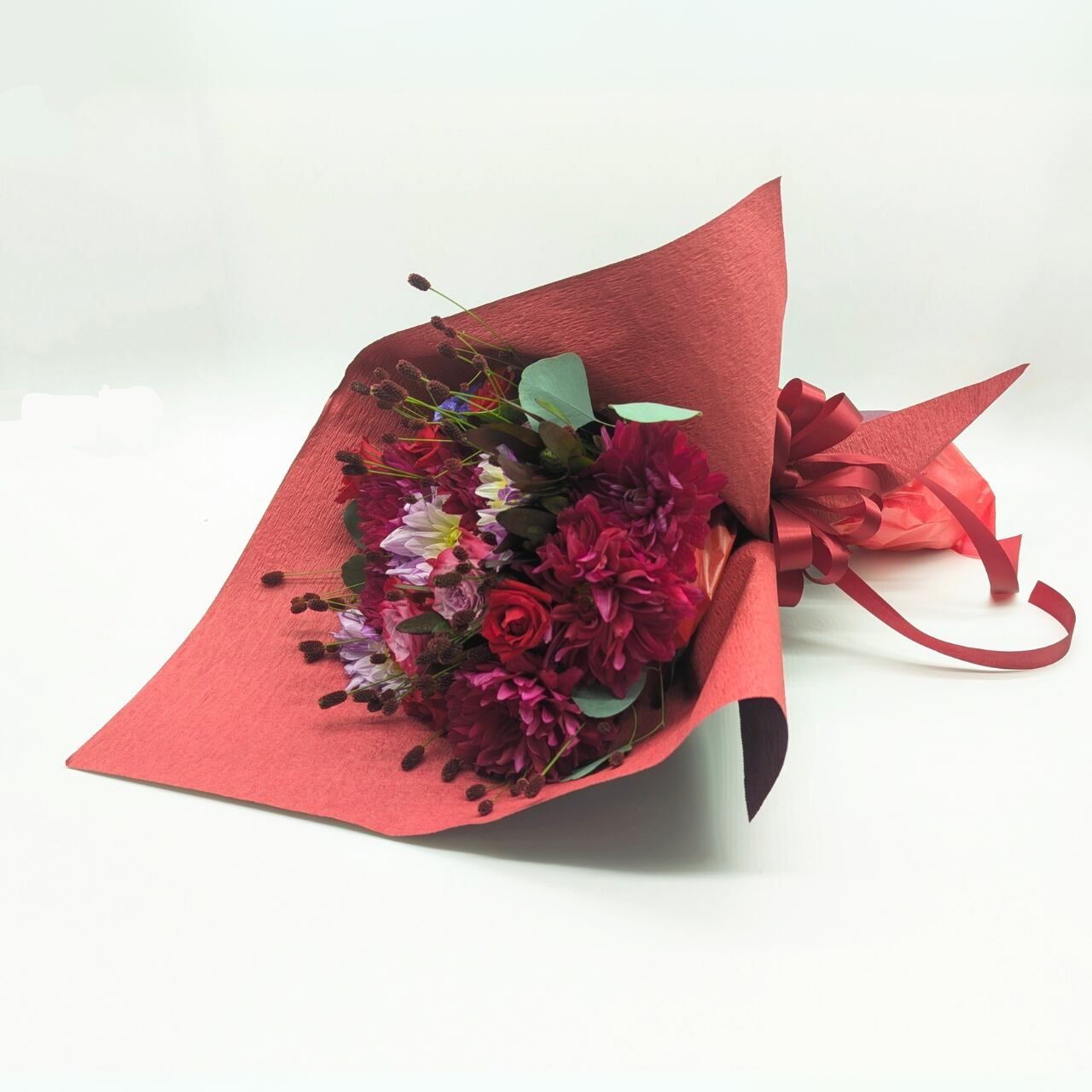 季節のお花使って赤色のブーケタイプでおまとめいたしました。